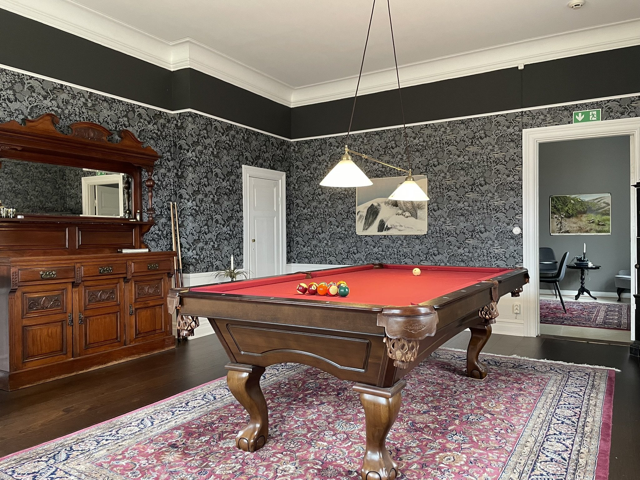 Rummet, med imponerande takhöjd och vackra trädetaljer, bjuder på en tidlös elegans där du kan spela biljard i en miljö som känns både historisk och samtidigt modern. Fönstren ger en fantastisk utsikt över parken, där naturens grönska och stillhet skapar en lugn och inspirerande atmosfär.